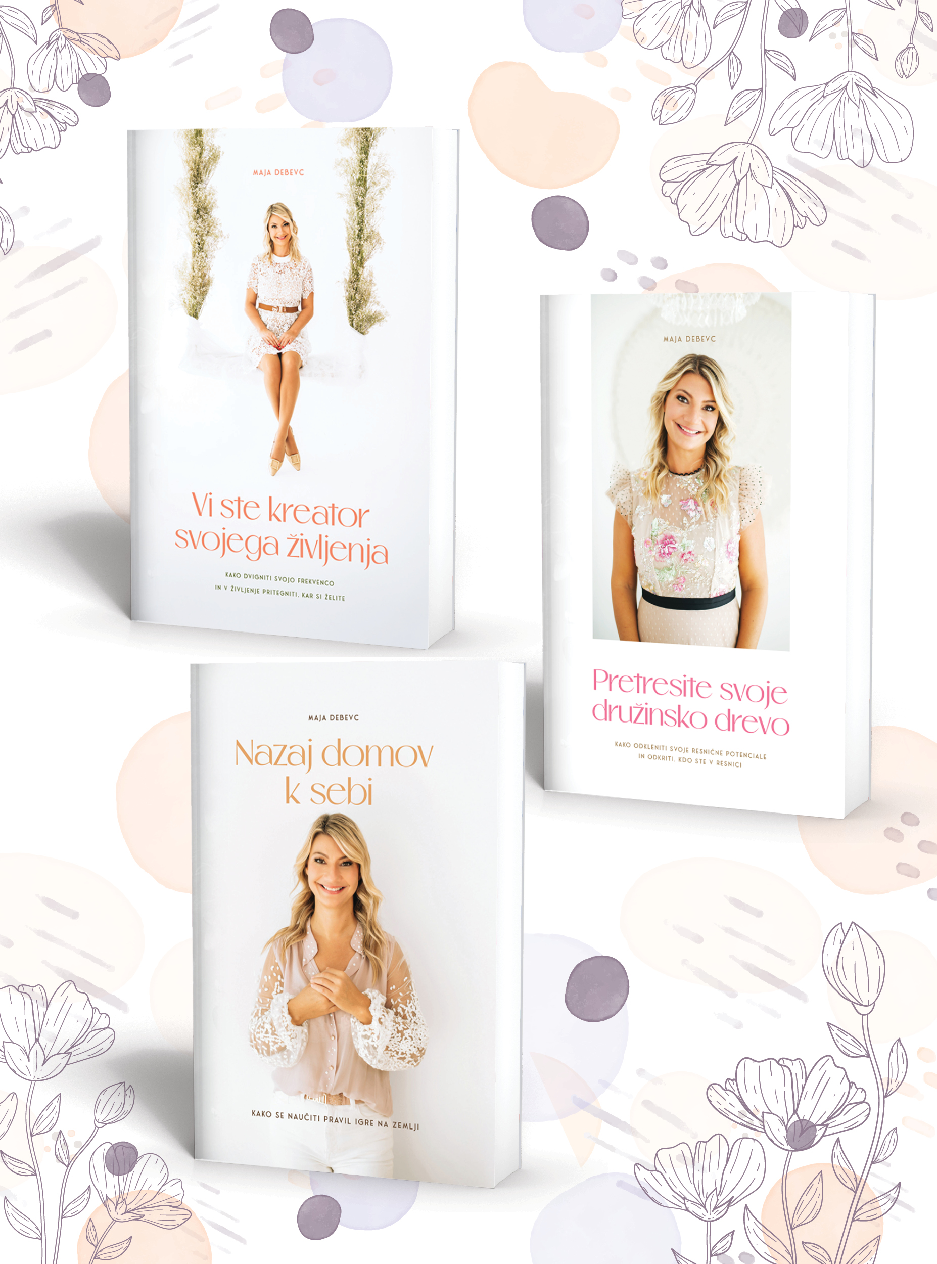 V knjigi Vi ste kreator svojega življenja se bova naučili: o tem kako dvigniti svojo frekvenco in v življenje pritegniti, kar si želiš. Na enostaven način so razloženi koraki za kreacijo tvojih želja in sanj. Naučili se boste ustvarjati življenje, ki si ga želite. V knjigi Pretresite svoje družinsko drevo pa boste našli – kako odkleniti svoje resnične potenciale in se soočiti s svojim družinskim drevesom. Knjiga Nazaj domov k sebi govori o tem, kako se naučiti pravil igre na Zemlji. Ta knjiga je kompas za vse, ki čutite, da je čas za obuditev spomina na to, kdo ste v resnici. Ste pripravljeni na vrnitev nazaj domov – k sebi? S teboj delim modrosti, ki so bile tisočletja namenoma skrite in potlačene. Prišel je čas, da se jih spomniš.